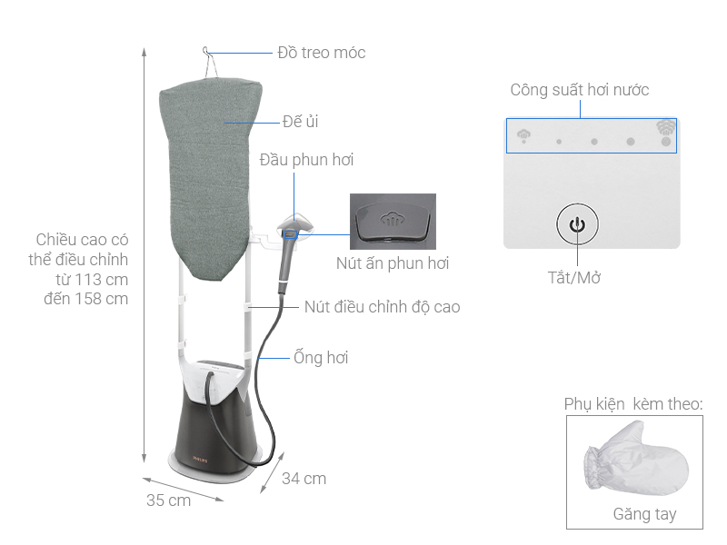 Diệt khuẩn và loại bỏ mùi hôi Tự điều chỉnh nhiệt độ từng loại vải (OptimalTEMP) Vừa ủi nằm vừa ủi đứng Điều chỉnh được chiều cao Không tạo vết cháy Có bánh xe di chuyển |