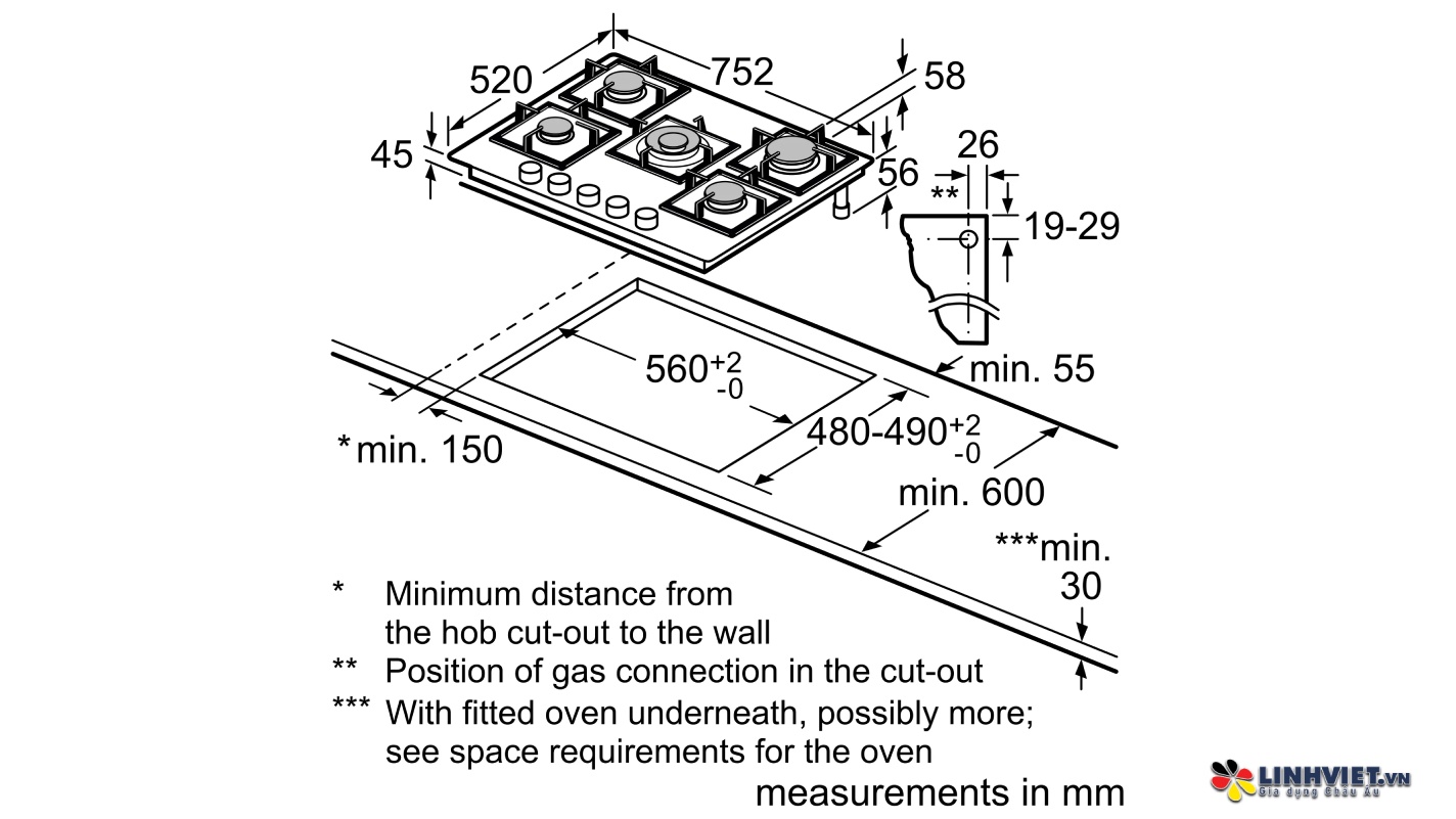 Bếp gas Bosch PPQ7A6B90 được sản xuất tại Tây Ban Nha, thuộc thương hiệu uy tín Bosch. Kích thước sản phẩm là 58 x 752 x 520 mm, dễ dàng lắp đặt với kích thước khoang bếp là 560 x (480 – 492) mm. Bếp hoạt động bằng khí gas 20 mbar và có khả năng sử dụng khí lỏng G30,31 28-30/37 mbar, mang đến sự linh hoạt trong sử dụng.