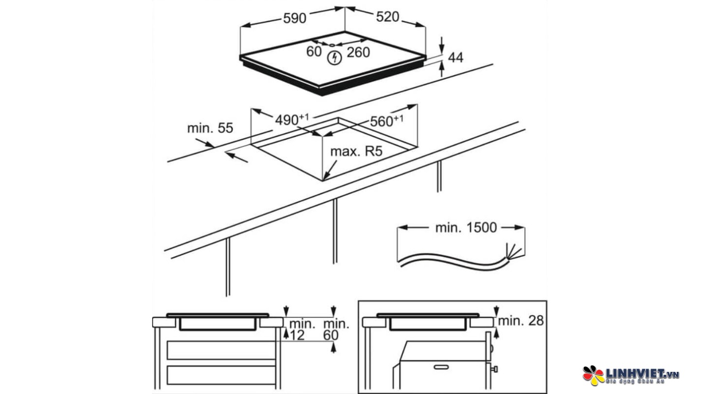 | Kích thước và công suất vùng nấu | Trái trên: Ø14,5cm – 1400W |