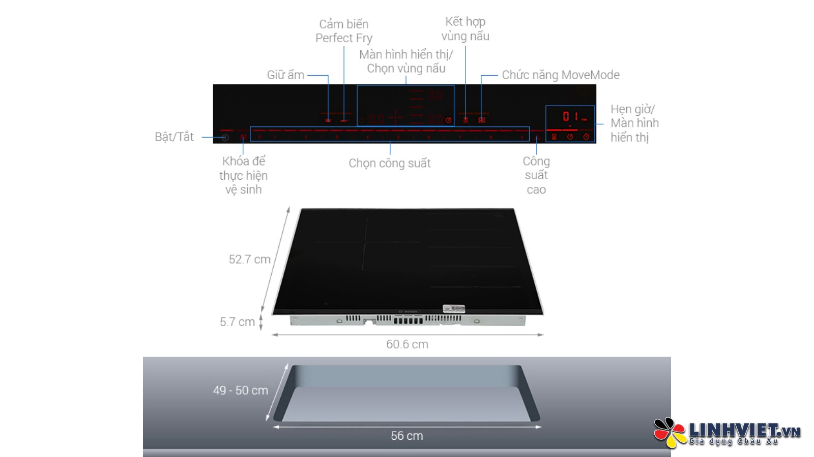 Bếp từ Bosch PXJ675DC1E được thiết kế với 3 vùng nấu: