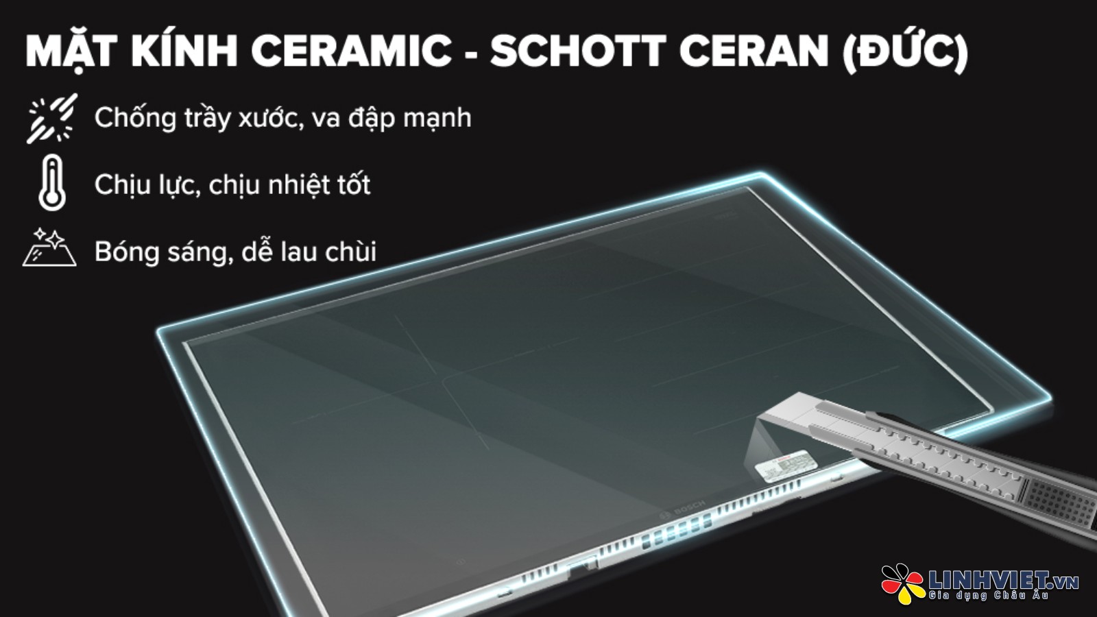 Bếp từ Bosch PXJ675DC1E được trang bị mặt kính Schott Ceran nổi tiếng của Đức, được làm từ ceramic. Kính có màu đen mờ sáng bóng, có khả năng nhìn xuyên qua và vượt trội về độ cứng, khả năng chịu nhiệt lên đến 750 độ C. Nhờ vậy, kính rất bền trước các tác động vật lý, giảm thiểu khả năng nứt vỡ khi đặt nồi lên bếp. Hơn nữa, loại kính này cũng rất dễ dàng để vệ sinh và lau chùi.