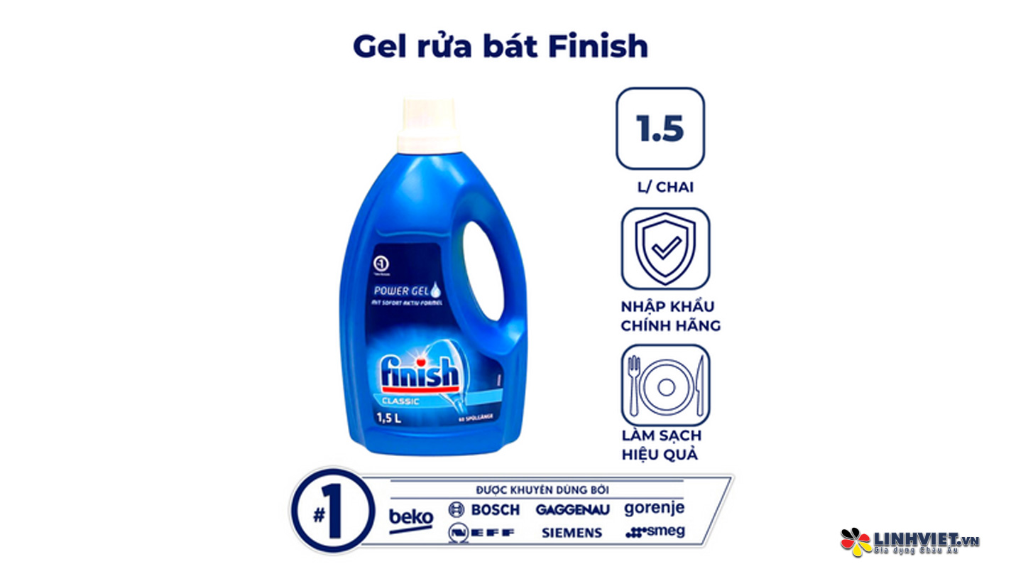 Gel rửa chén Finish 1.5L là sản phẩm chuyên dụng dành cho máy rửa bát với công thức làm sạch đặc biệt. Sản phẩm được sản xuất và đóng gói theo tiêu chuẩn nghiêm ngặt của Đức, đảm bảo xử lý hiệu quả nguồn nước cung cấp cho máy rửa bát gia đình.