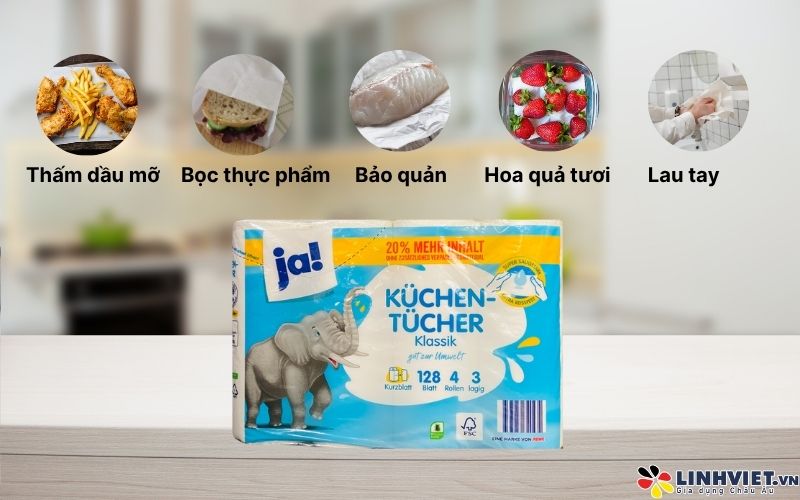 Mỗi bịch gồm 4 cuộn, mỗi cuộn có 128 tờ – đáp ứng tốt nhu cầu sử dụng hằng ngày. Thiết kế lõi rỗng giúp dễ dàng lắp vào các trụ giấy thông dụng, giúp không gian bếp luôn gọn gàng và tiện lợi khi thao tác.