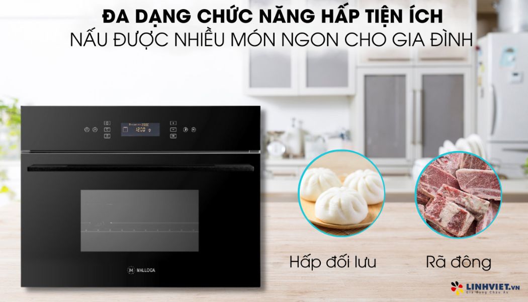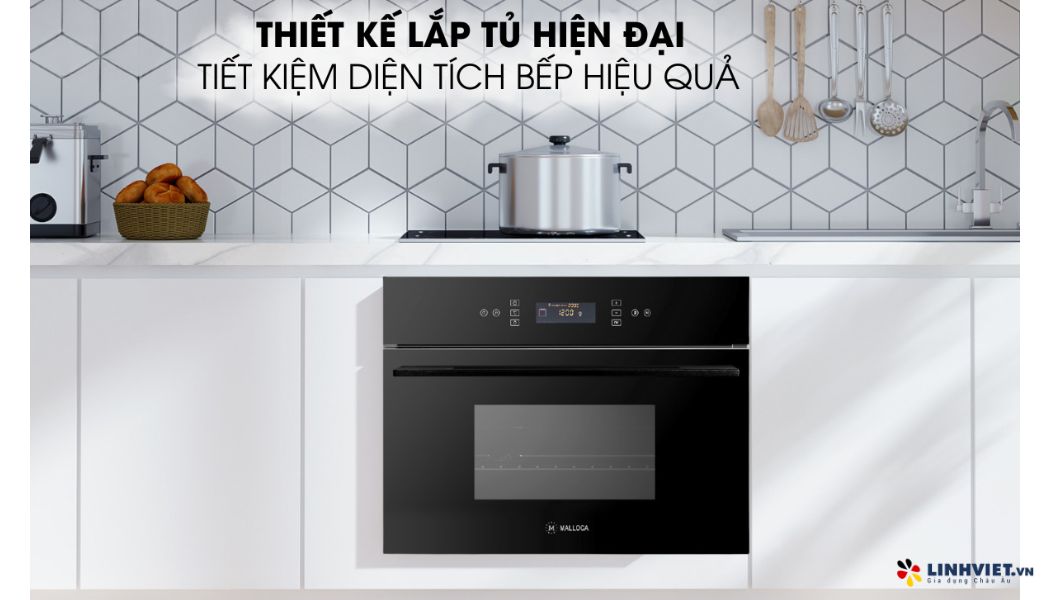 Lò hấp Malloca được thiết kế lắp âm hiện đại và sang trọng, giúp không gian bếp trở nên gọn gàng và thẩm mỹ hơn. Thân lò được giấu gọn trong tủ bếp, kết hợp mặt kính đen và tay nắm inox phủ sơn đen, tạo nên vẻ ngoài nổi bật và thu hút cho gian bếp của bạn.
