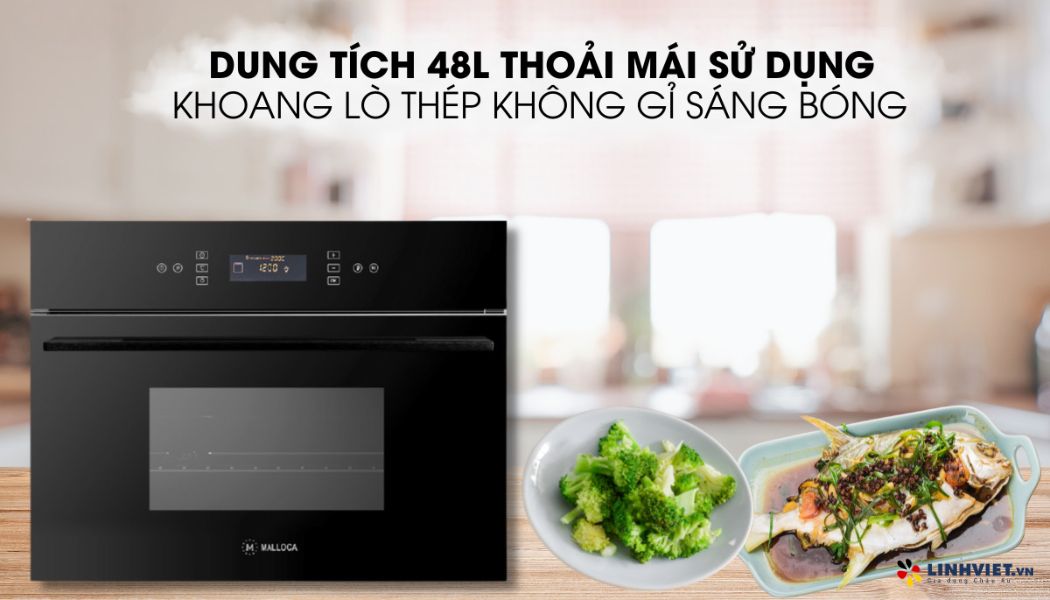 Lò hấp Malloca MST-48CP có dung tích 48L rộng rãi, đáp ứng nhu cầu nấu hấp cho gia đình từ 4-5 thành viên. Với thiết kế sang trọng tông đen và lắp đặt âm tủ, lò không chỉ tiện dụng mà còn mang lại sự gọn gàng cho không gian bếp.