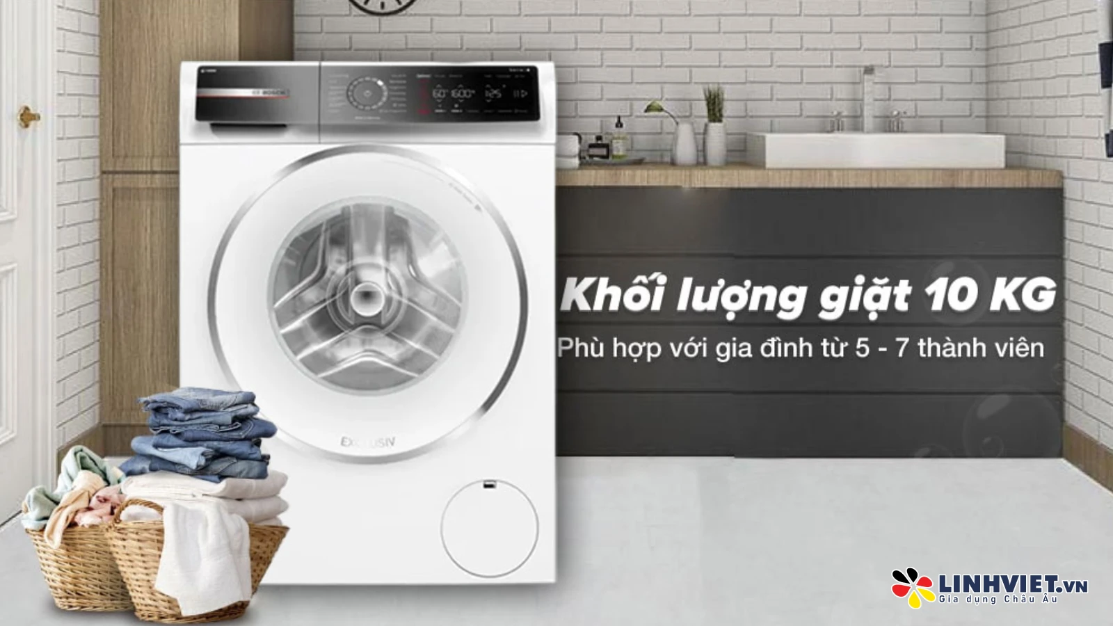 Máy giặt Bosch WGB256A90 với dung tích lồng giặt 70 lít, cho phép giặt tối đa 10kg quần áo trong một lần. Công suất này hoàn toàn đáp ứng nhu cầu giặt giũ của gia đình từ 5-7 người, giúp tiết kiệm thời gian và công sức cho mỗi lần giặt.