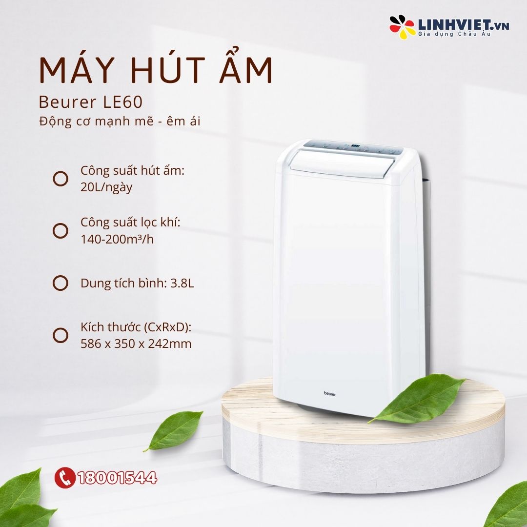 Máy có hai chế độ: hút ẩm liên tục và hút ẩm theo độ ẩm mục tiêu. Chức năng tự động tắt khi bình đầy đảm bảo an toàn. Đặc biệt, Beurer LE60 còn tích hợp chức năng làm sạch không khí bằng ion âm, giúp loại bỏ bụi mịn trong không khí.