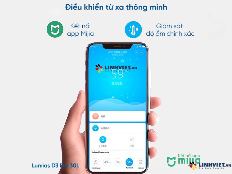 Máy hút ẩm Lumias NWT D3 Pro 30L được trang bị bộ điều khiển từ xa qua ứng dụng MiHome/Mijia, cho phép bạn dễ dàng thao tác trên điện thoại. Bạn có thể bật/tắt máy, hẹn giờ, và theo dõi độ ẩm không khí mọi lúc.