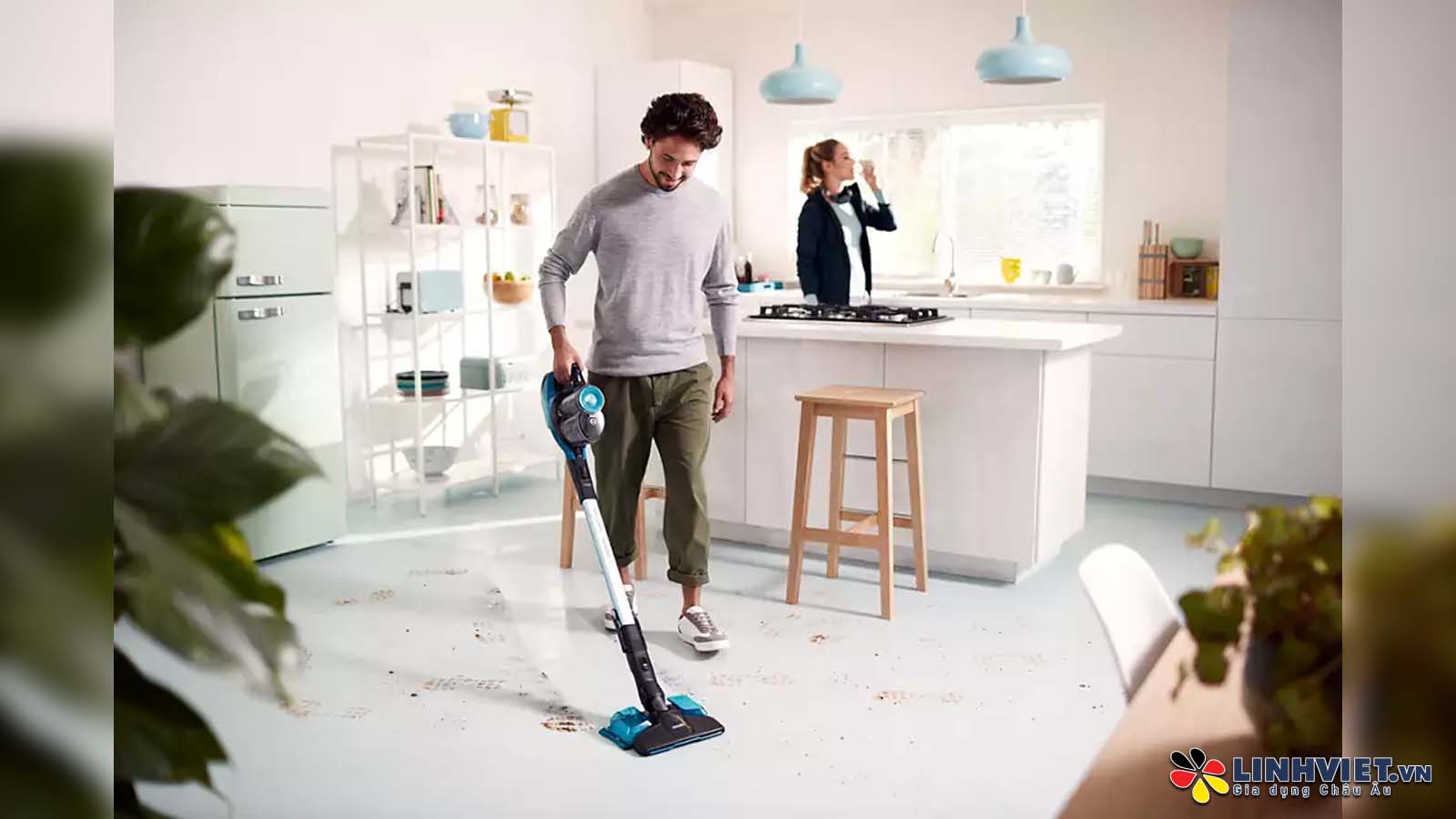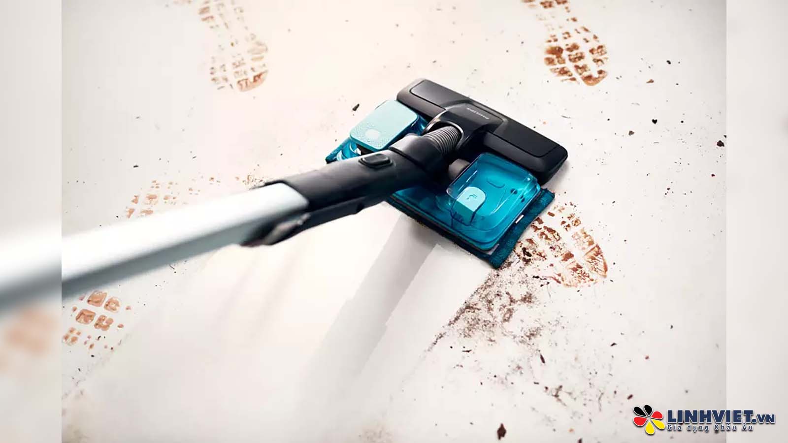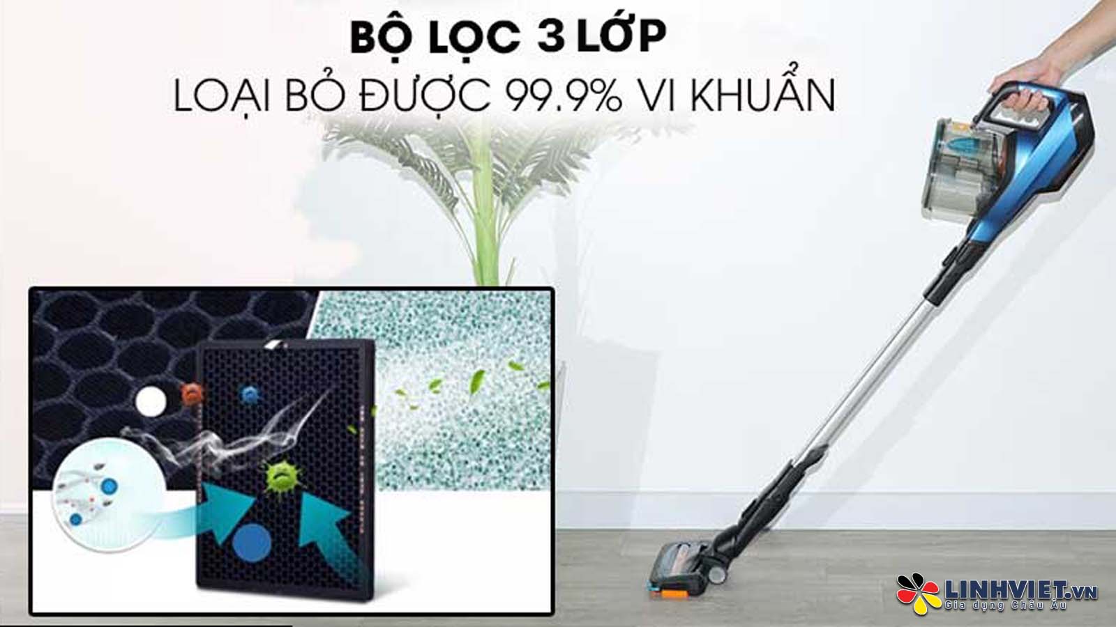 Hệ thống hút bụi và lau sàn độc đáo: Giúp loại bỏ tới 99% vi khuẩn trong một lần đẩy. Chức năng kiểm soát lượng nước duy trì độ ẩm tối ưu trên sàn, cùng với tấm lau vi sợi có thể giặt tay hoặc bằng máy.