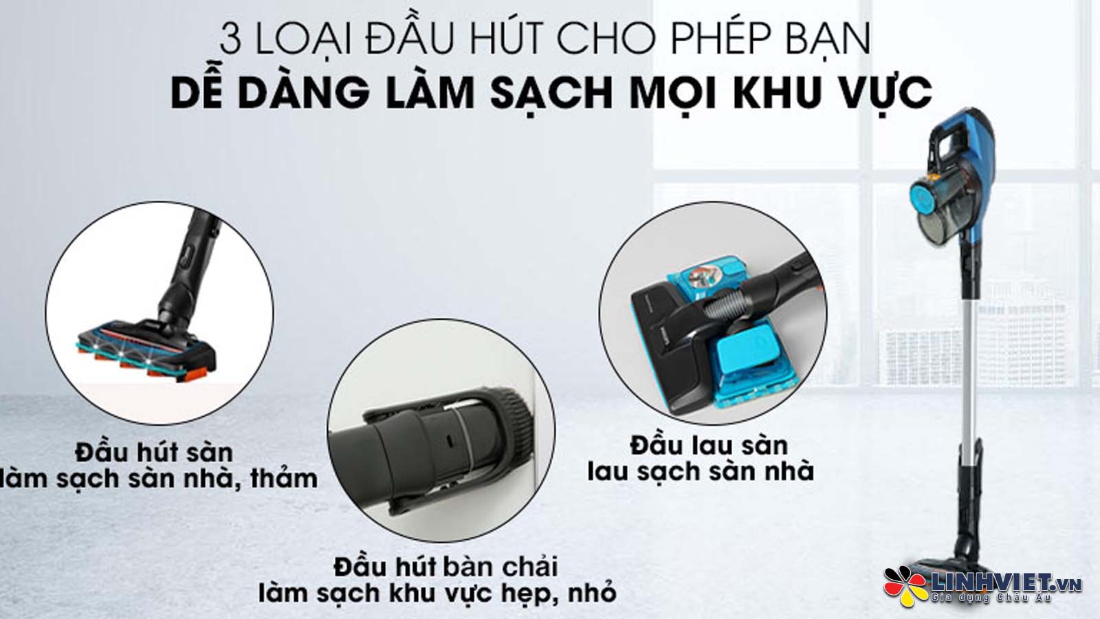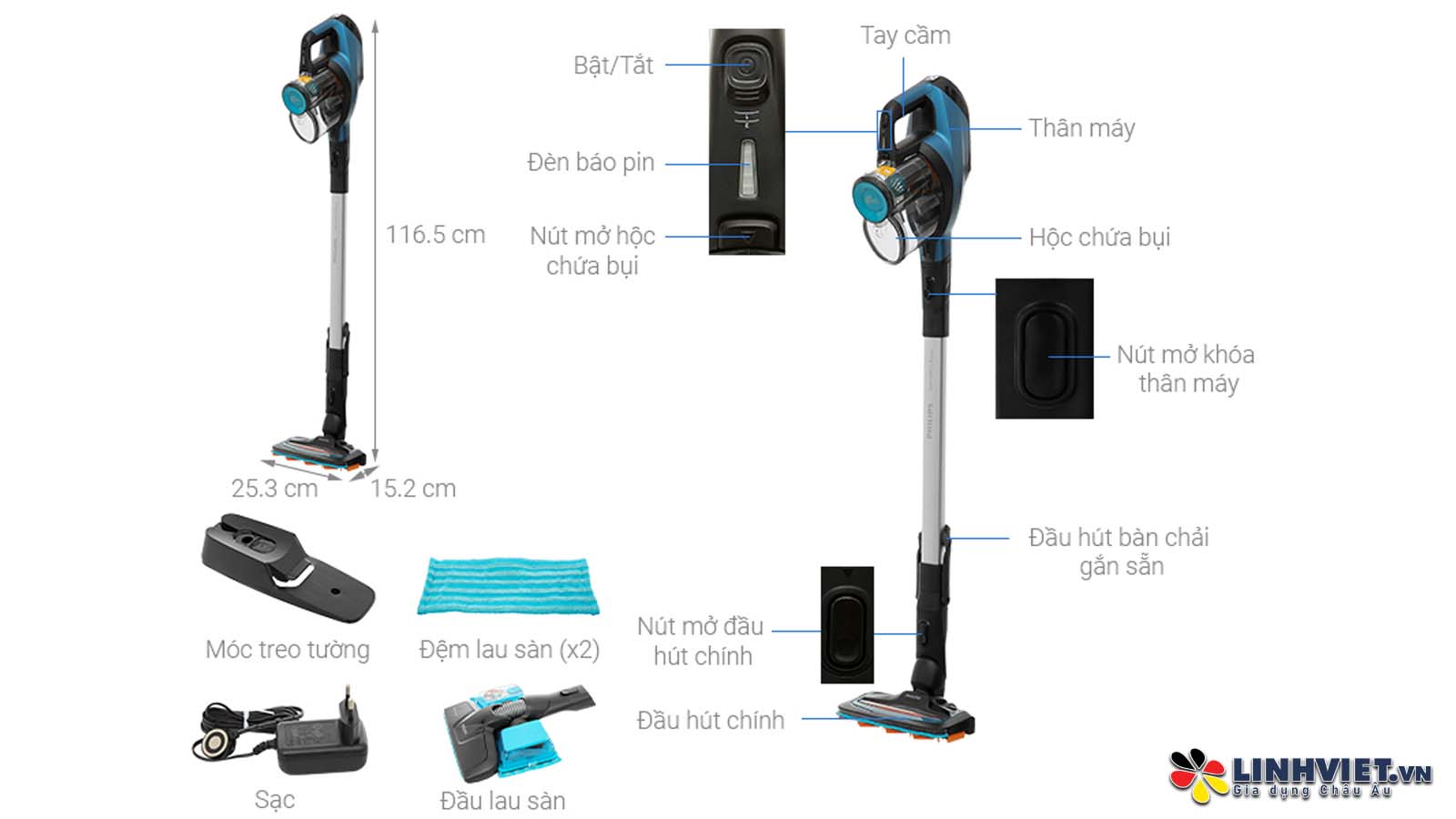 Tích hợp tay cầm và phụ kiện tiện lợi: Phụ kiện dễ dàng sử dụng chỉ bằng một nút nhấn, tay cầm có thể tháo rời giúp kết hợp hai thiết bị thành một. Phụ kiện bàn chải được gắn sẵn trong ống, luôn sẵn sàng cho việc làm sạch trần nhà và kệ.