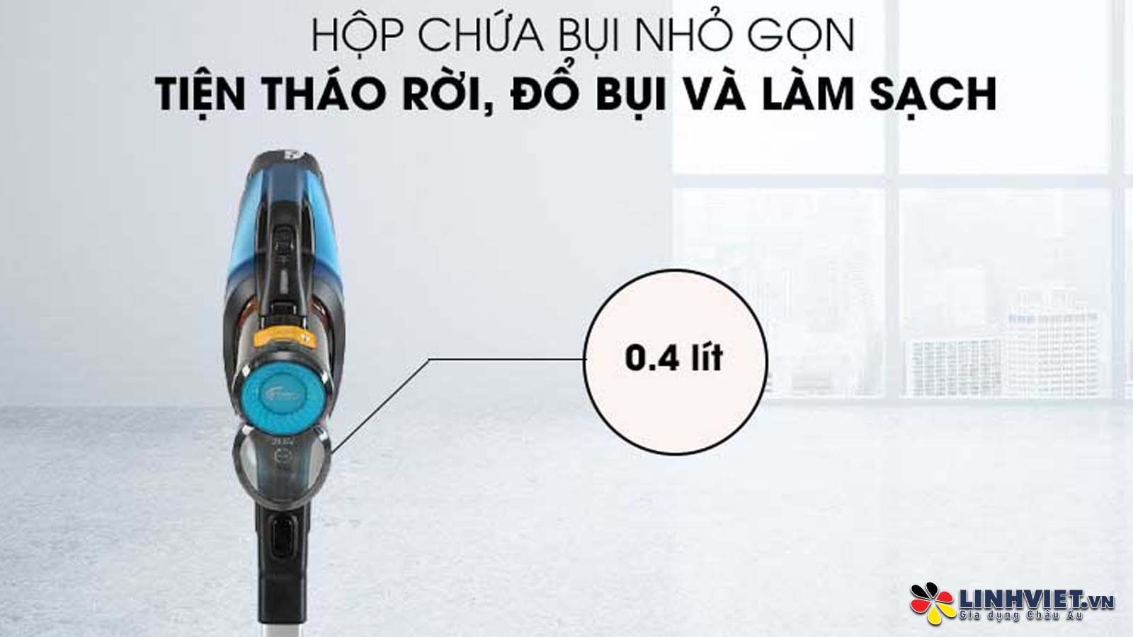 Thiết kế hộp chứa bụi độc đáo: Hộp chứa bụi trong suốt với dung tích 0.4 lít giúp dễ dàng quan sát lượng bụi bên trong và tiện lợi cho việc tháo lắp, đổ bụi.