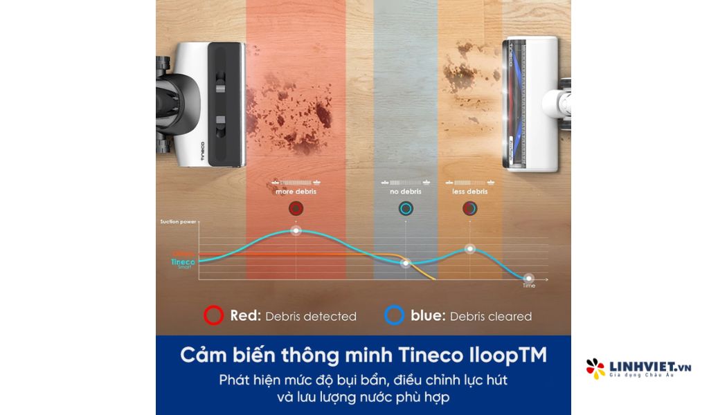 iLoop là công nghệ độc quyền của Tineco, cho phép máy Tineco Switch S7 tự động phân tích và điều chỉnh lực hút cùng lượng nước phù hợp để làm sạch hoàn toàn vết bẩn. Khi phát hiện vết bẩn, màn hình sẽ chuyển từ màu đỏ sang xanh khi đã sạch.