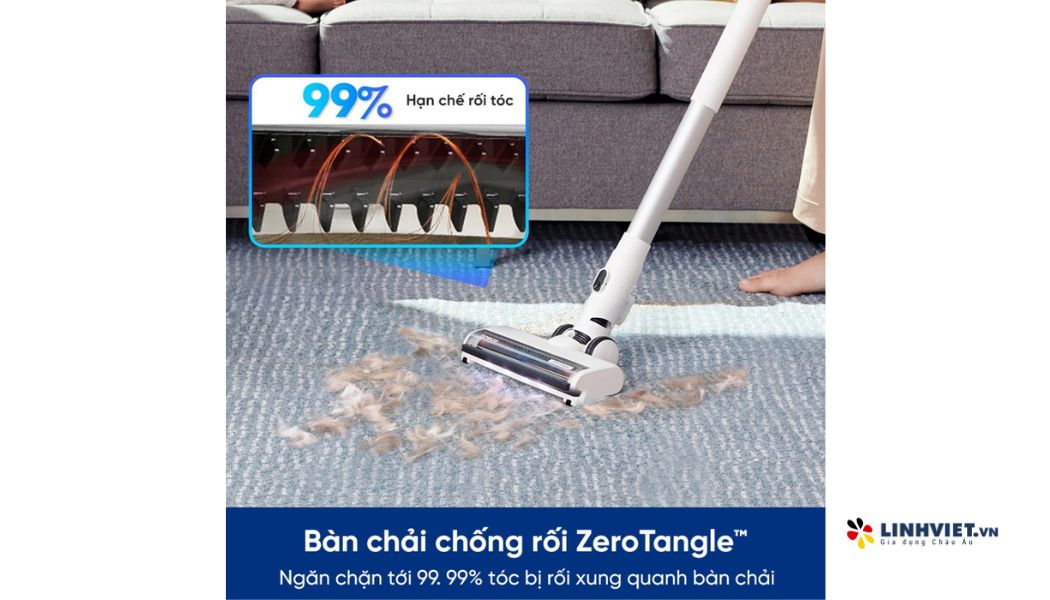 Công nghệ Zerotangle độc quyền của Ecovacs được tích hợp trong máy hút bụi Tineco Switch S7. Thiết kế lông chổi hình chữ V kết hợp lược kép giúp tăng hiệu suất hút và giảm rối con lăn. Việc tháo gỡ sau khi sử dụng cũng rất dễ dàng, vì các sợi tóc và lông quấn theo một hướng.