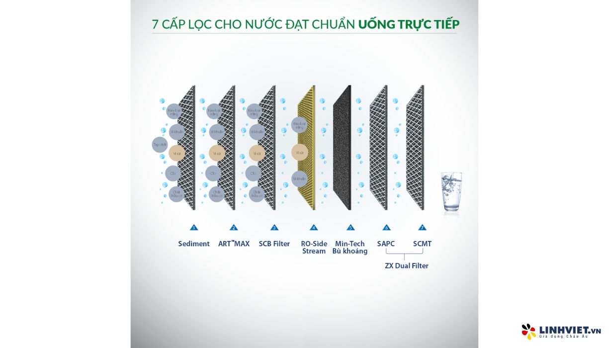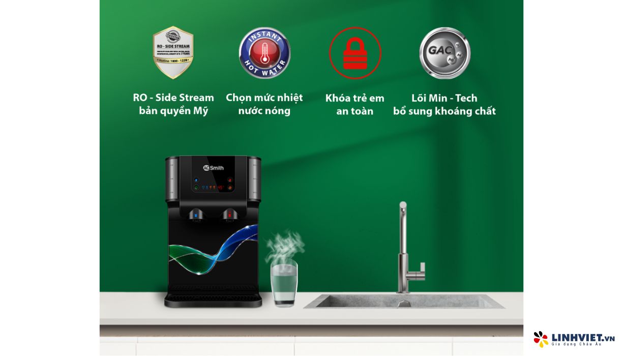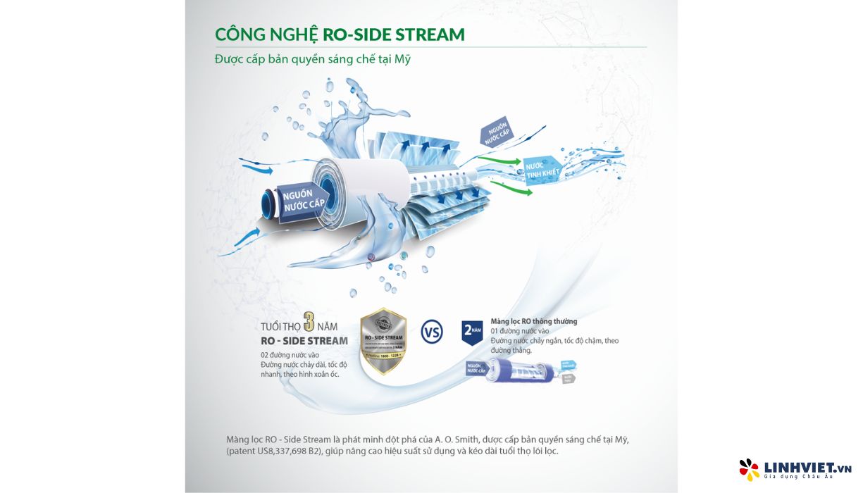 Công nghệ RO – Side Stream bản quyền Mỹ: Với màng lọc RO tiên tiến, sản phẩm không chỉ tăng tỷ lệ thu hồi nước tinh khiết đến 1:1 mà còn kéo dài tuổi thọ lõi lọc lên 1.5 lần. Công nghệ này loại bỏ hiệu quả các tạp chất, kim loại nặng và vi khuẩn gây hại, mang đến giải pháp tiết kiệm và an toàn.