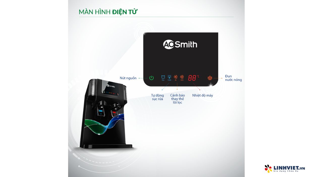 Màn hình điện tử thông minh: Màn hình hiển thị trực quan các thông tin như nhiệt độ nước, chỉ số TDS và tình trạng lõi lọc, giúp bạn dễ dàng theo dõi và kiểm soát chất lượng nước.