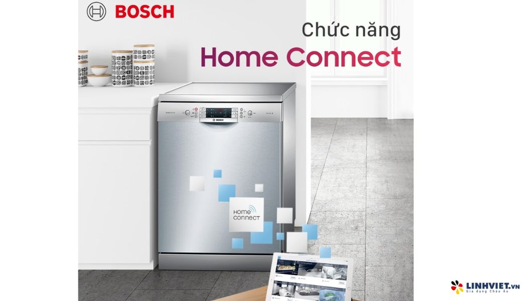 Home Connect là tính năng công nghệ hiện đại trên máy rửa bát Bosch, cho phép bạn kết nối và điều khiển máy từ xa qua ứng dụng Home Connect bằng kết nối Wi-Fi. Với tính năng này, cuộc sống hàng ngày trở nên dễ dàng và chủ động hơn, giúp bạn quản lý hoạt động của máy rửa bát một cách thuận tiện.