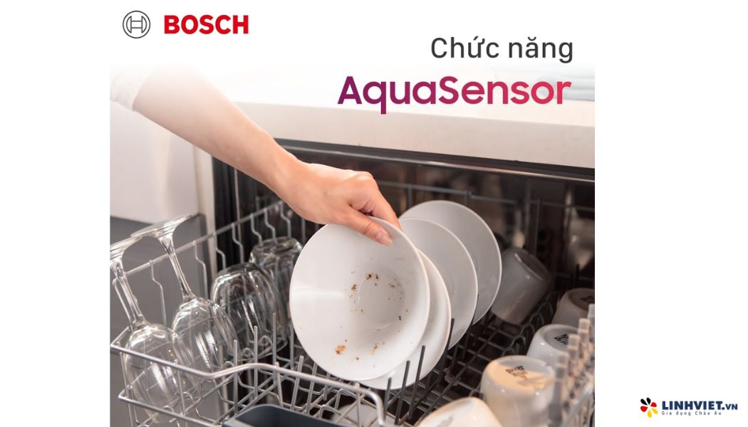 Cảm biến AquaSensor tự động điều chỉnh lượng nước sử dụng dựa vào loại và mức độ bẩn của bát đĩa. Nhờ vào khả năng phát hiện độ bẩn, máy rửa bát sẽ chọn lựa giữa 2 chu trình rửa và xả khác nhau, điều chỉnh số lần xả và thời gian rửa cho hiệu quả tối ưu.
