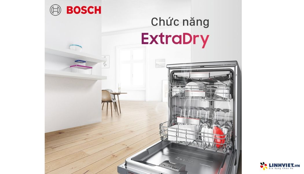Chức năng ExtraDry là tính năng sấy tăng cường, tăng nhiệt độ trong quá trình tráng cuối để cải thiện khả năng bay hơi của nước. Điều này giúp bát đĩa khô nhanh hơn và sạch sẽ hơn sau mỗi lần rửa.