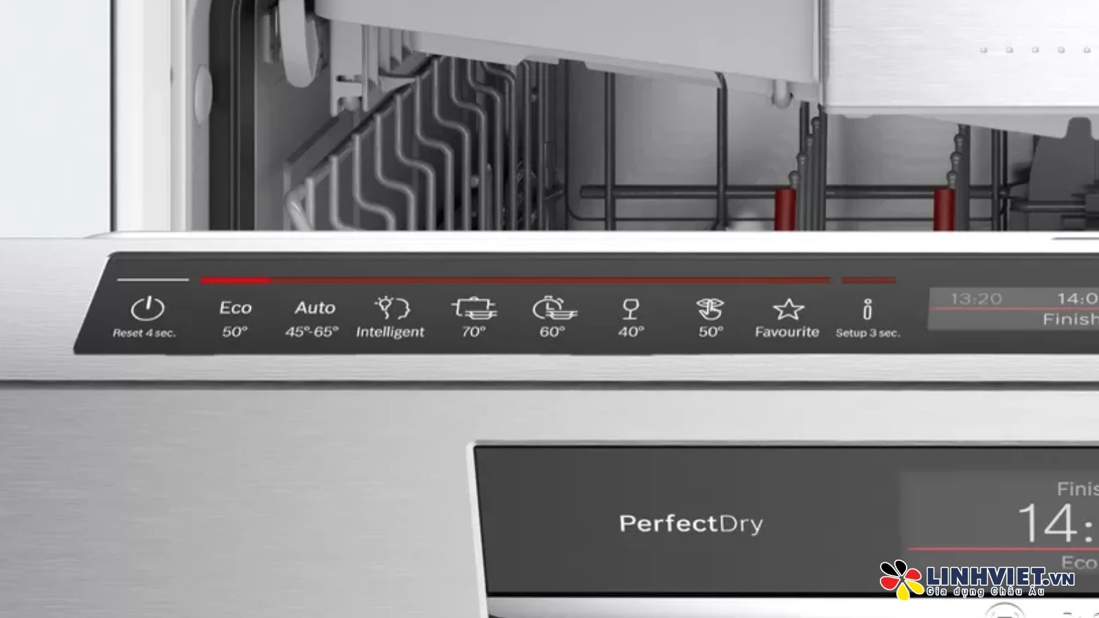 Khi người dùng muốn bát đũa khô ngay lập tức hoặc không hài lòng với độ khô của chương trình rửa đã chọn, có thể chọn thêm chức năng sấy tăng cường Extra Dry. Thời gian rửa sẽ cộng thêm 10 phút, trong đó nhiệt độ nước sẽ tăng cao, giúp bát đũa được sấy khô ráo, tránh tình trạng đọng nước ở bát và thành máy.