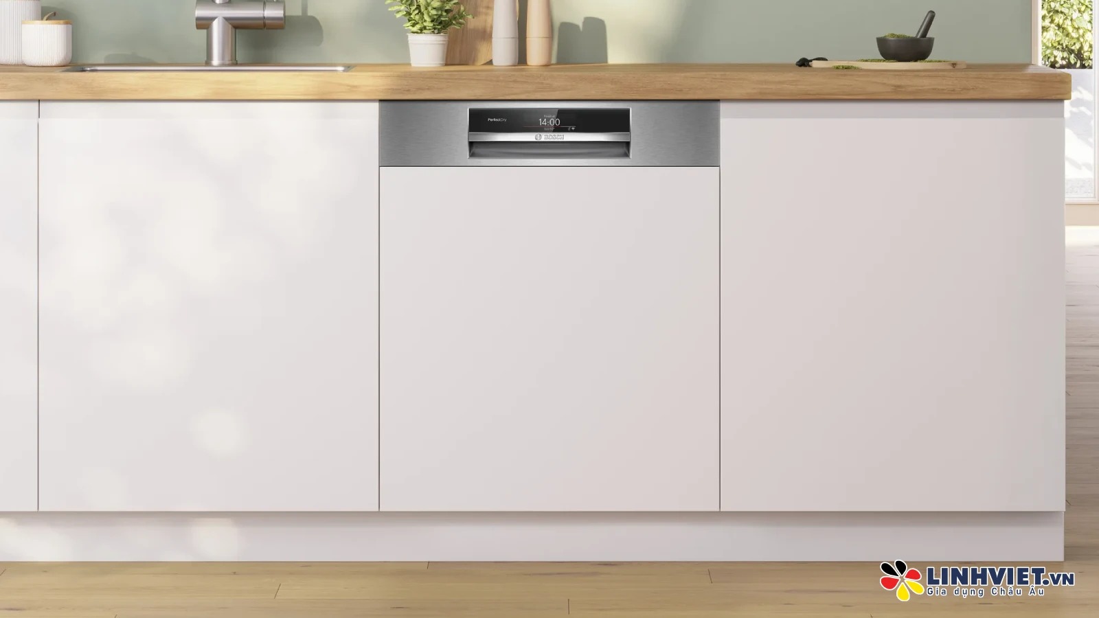Máy rửa bát có thiết kế bán âm, được làm từ thép không gỉ. Người dùng chỉ cần ốp thêm tấm gỗ vào mặt trước để đồng bộ với hệ tủ, giúp nhà bếp trở nên sang trọng và tinh tế hơn.