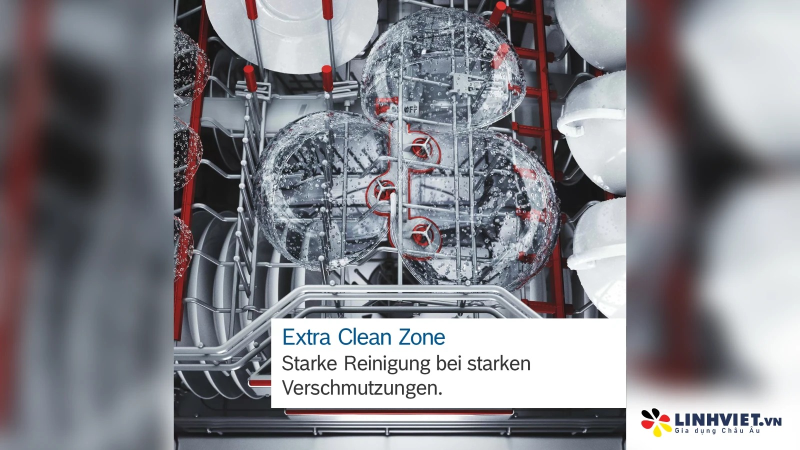 Hệ thống vòi phun thủy lực Extra Clean Zone tăng áp suất nước, giúp rửa sạch bát đĩa ở giàn giữa một cách hiệu quả hơn. Nhờ vào Extra Clean Zone, bát đĩa được làm sạch tối ưu với lượng nước nhiều hơn mà không cần tốn thêm chất tẩy rửa.