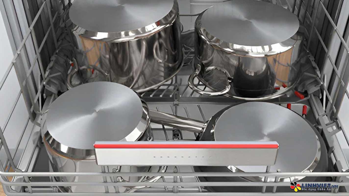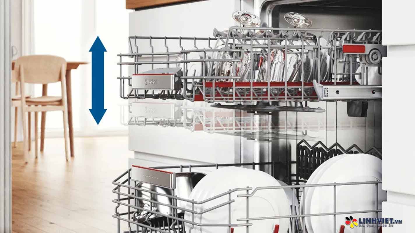 Máy cũng được trang bị hệ thống Rackmatic, cho phép điều chỉnh giàn rửa dễ dàng theo nhu cầu. Bạn có thể thay đổi độ cao của giàn rửa thông qua khớp nâng hạ, ngay cả khi giỏ chứa đã đầy, giúp tối ưu hóa không gian và linh hoạt sắp xếp bát đĩa một cách thuận tiện.