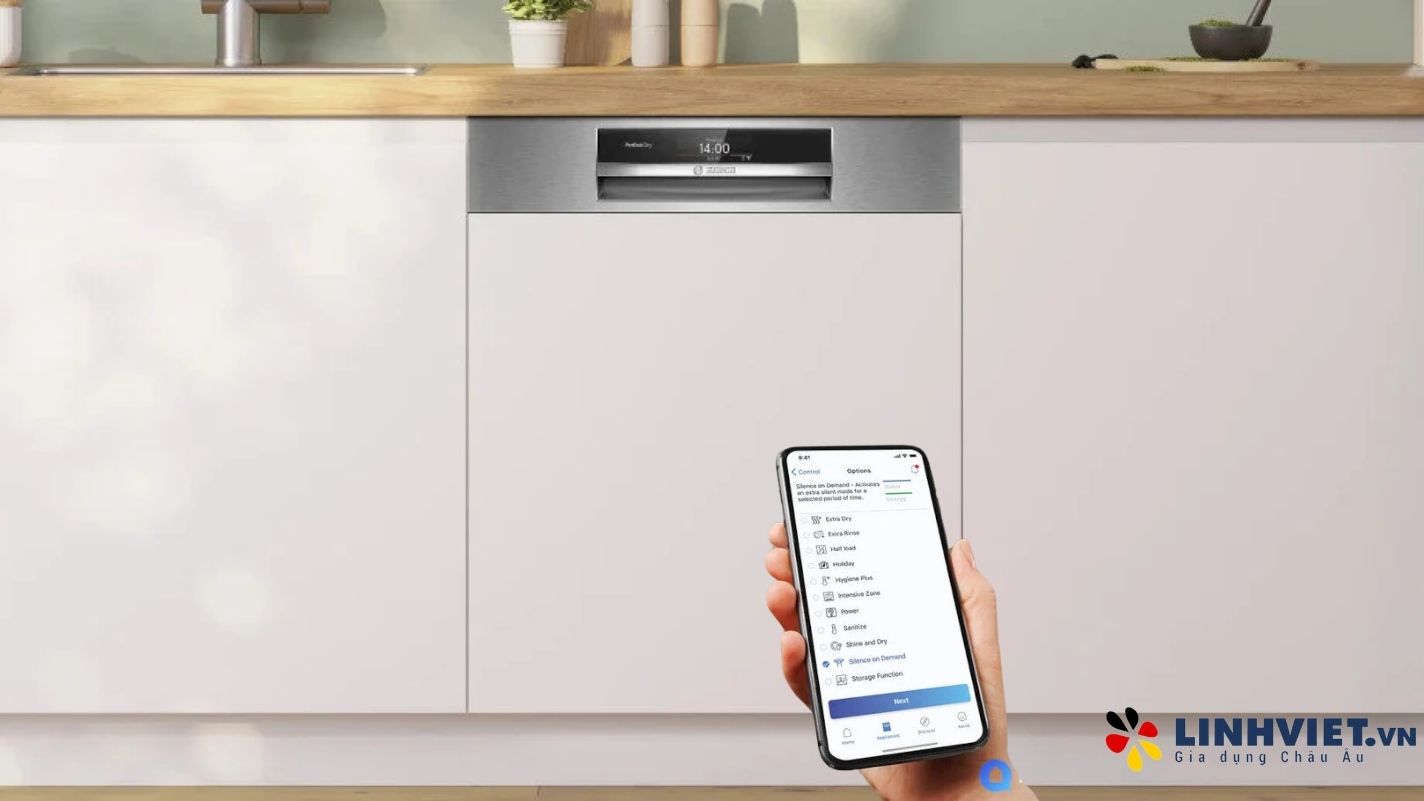 Máy rửa bát Bosch SMI8YCS02E tích hợp ứng dụng Home Connect, cho phép bạn dễ dàng theo dõi và kiểm soát chương trình rửa ngay trên điện thoại. Ứng dụng này còn phân tích thói quen rửa, sấy và thời gian sử dụng của bạn, giúp máy tự động điều chỉnh các thông số để tối ưu hóa theo nhu cầu cá nhân. Nhờ đó, bạn vừa rửa bát hiệu quả theo ý muốn, vừa tiết kiệm nước và năng lượng, góp phần bảo vệ môi trường.