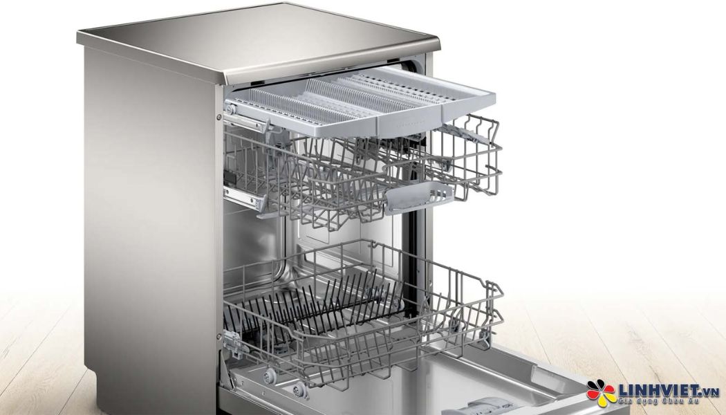 Máy rửa bát Bosch SMS4HMI07E được trang bị hệ thống giàn rửa thông minh, bao gồm 1 ngăn kéo và 2 giàn rửa (trên và dưới). Ngăn kéo trên cùng lý tưởng cho các dụng cụ nhỏ như dao, kéo và đũa, trong khi giàn trên chứa chén bát, đĩa và ly cỡ vừa. Giàn dưới được thiết kế để chứa các dụng cụ lớn hơn như nồi, chảo và bát tô.
