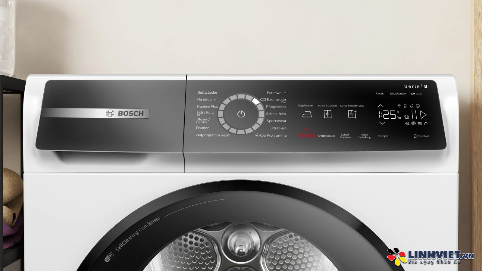 Tính năng SmartDry của máy sấy Bosch giúp bạn dễ dàng chọn chương trình sấy phù hợp. Công nghệ này tự động kết nối với máy giặt và dựa trên chu trình giặt cuối cùng để lựa chọn chế độ sấy thích hợp, giúp bạn không cần phải lo lắng về việc chọn chương trình sấy, chỉ cần chờ đợi kết quả.