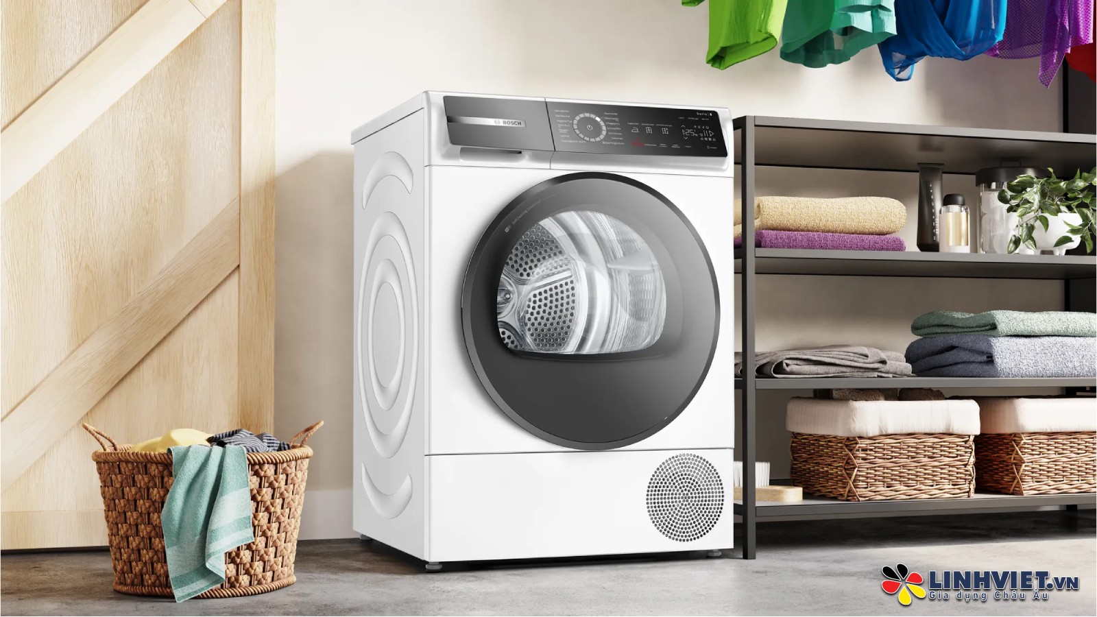 Với dung tích lồng chứa 112 lít, máy sấy Bosch có khả năng sấy lên đến 9kg quần áo, phù hợp cho gia đình 4-6 người hoặc khi cần làm khô nhanh một lượng quần áo nhỏ.