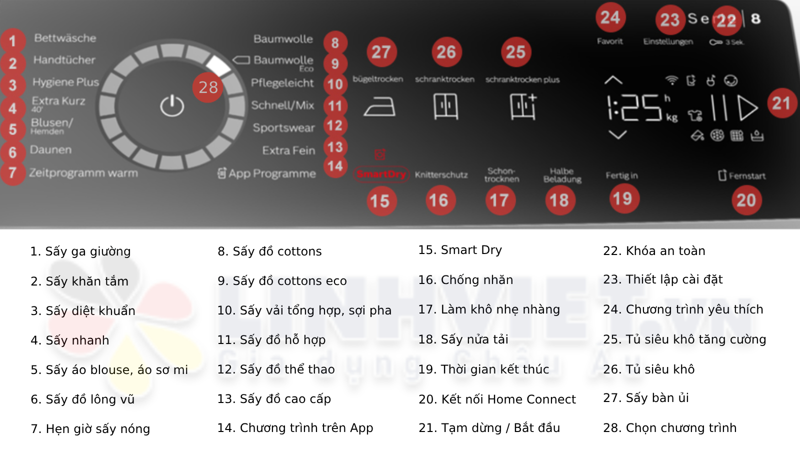 Người dùng có thể lựa chọn 1 trong 14 chương trình sấy dưới đây tùy thuộc vào nhu cầu của gia đình: