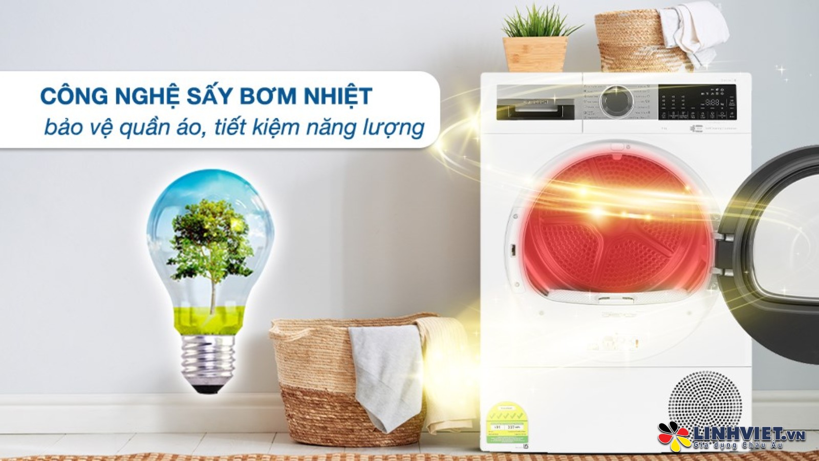 Công nghệ Heatpump trong máy sấy Bosch giúp sấy quần áo hiệu quả hơn so với các máy sấy thông thường dùng điện trở. Heatpump sử dụng máy nén khí gas R290 để tạo ra luồng khí nóng sấy khô quần áo, đồng thời tiết kiệm điện năng vì không dùng điện trực tiếp cho quá trình sấy.