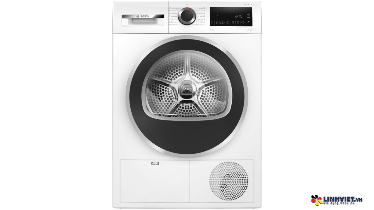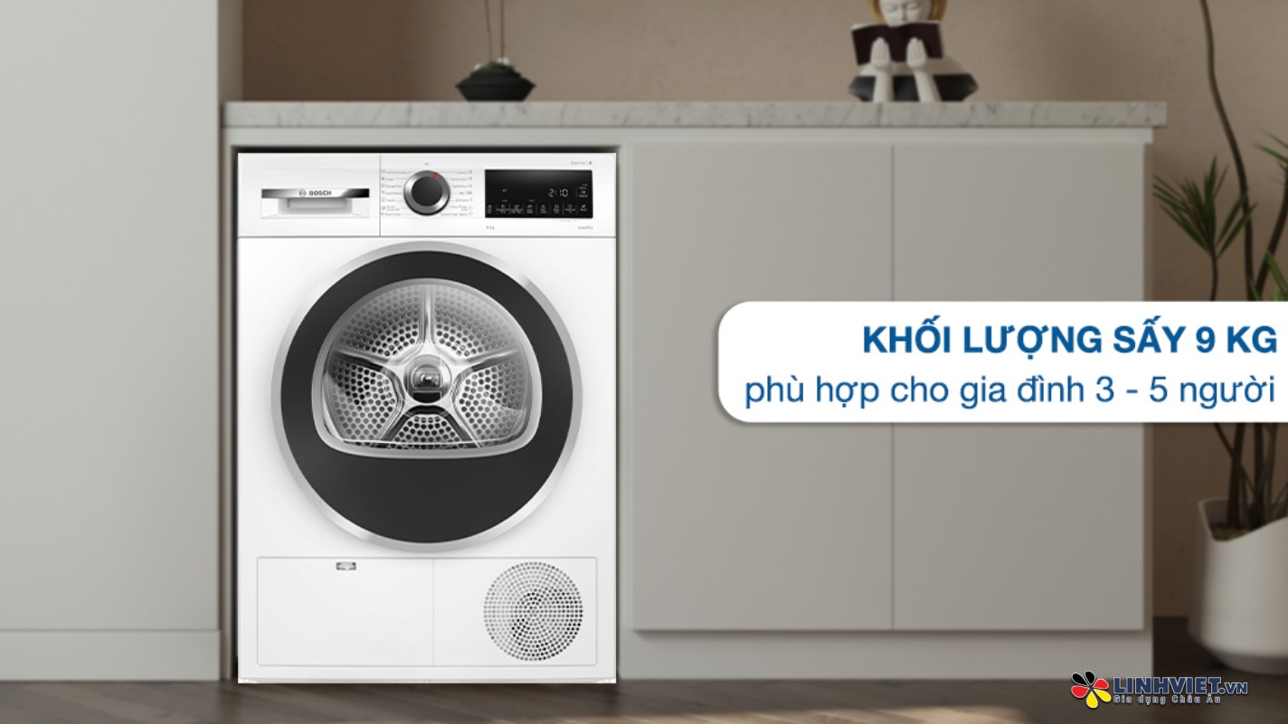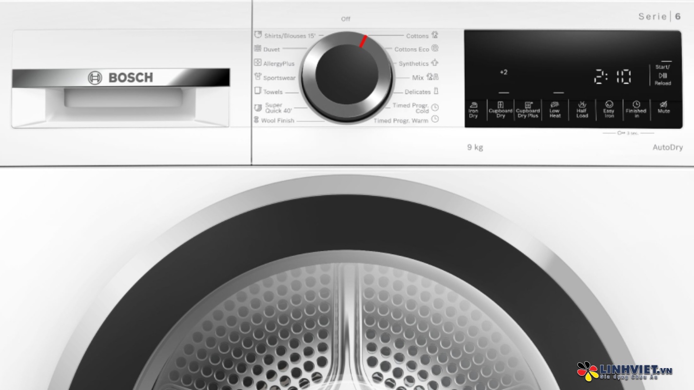 Máy sấy Bosch với khối lượng sấy 9 kg là lựa chọn lý tưởng cho gia đình 3-5 thành viên. Máy được trang bị 14 chương trình sấy đa dạng, từ sấy tiêu chuẩn (Cottons), sấy tiết kiệm (Cottons Eco), đến các chế độ dành riêng cho từng loại vải như tổng hợp (Synthetics), hỗn hợp (Mixture), đồ len (Woollens Finish), và thậm chí là sấy nhanh trong 40 phút (Super Quick 40min). Ngoài ra, máy còn có chương trình sấy cho khăn, chăn mền, đồ thể thao, áo sơ mi và cả đồ tơ lụa. Đặc biệt, với tính năng sấy nhanh trong 40 phút, bạn sẽ có ngay quần áo khô một cách tiện lợi, tiết kiệm thời gian tối đa.