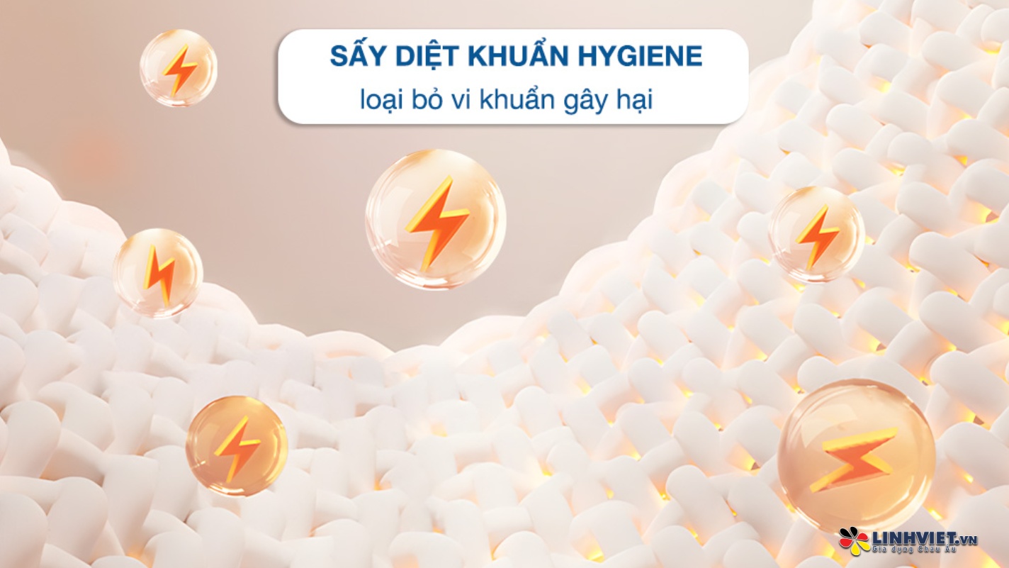 | Tiện ích: | Sấy diệt khuẩn HygieneKhóa trẻ emEcoSilence – Hoạt động êm ái, hạn chế tiếng ồnChuông báo lấy quần áo khi kết thúcAutoDry – Tự động nhận biết khi đồ khô |