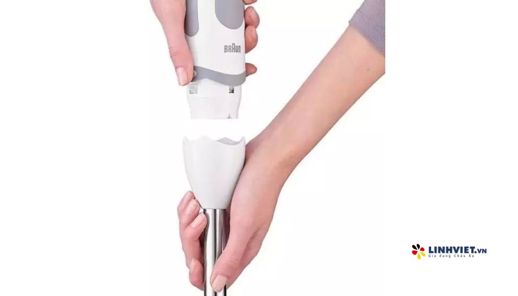 Máy xay cầm tay Braun MQ5235 cho phép dễ dàng tháo lắp các phụ kiện tùy theo nhu cầu sử dụng. Bạn có thể chọn đầu xay inox để xay sinh tố, cháo, súp; đầu đánh trứng cho việc đánh trứng, kem, và trộn thực phẩm; hoặc cốc xay để xay rau, hạt, đồ khô, và thịt. Quá trình tháo lắp rất đơn giản, tiết kiệm thời gian và công sức.