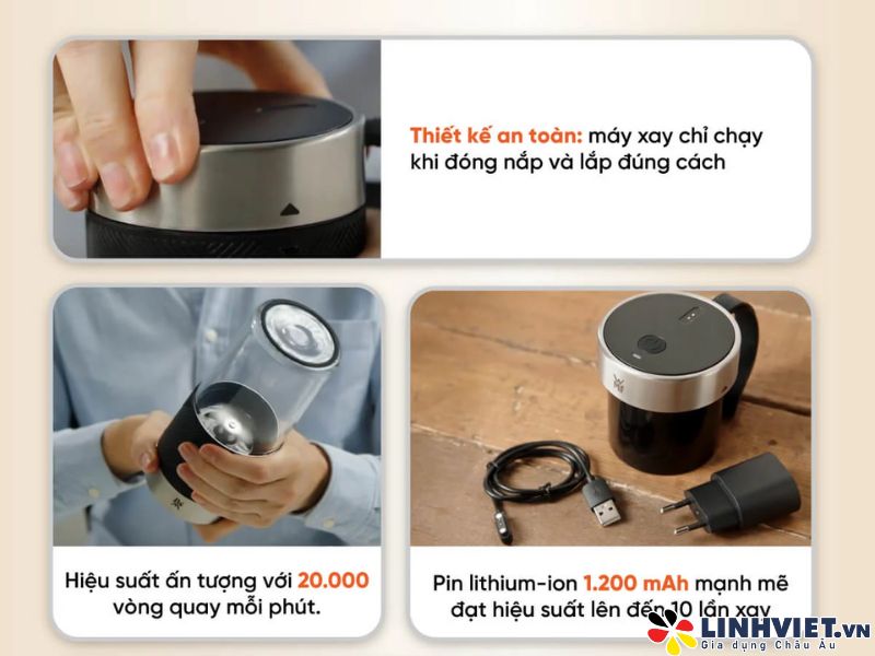 Khác với các dòng máy xay truyền thống, WMF Küchenminis sử dụng pin lithium-ion có thể sạc lại qua cổng USB Type-C, rất tiện lợi. Sau khi sạc đầy (khoảng 2–3 giờ), máy có thể sử dụng được từ 8–10 lần xay mà không cần cắm nguồn, cực kỳ phù hợp với nhu cầu di chuyển hoặc sử dụng ở nơi không có ổ cắm điện.
