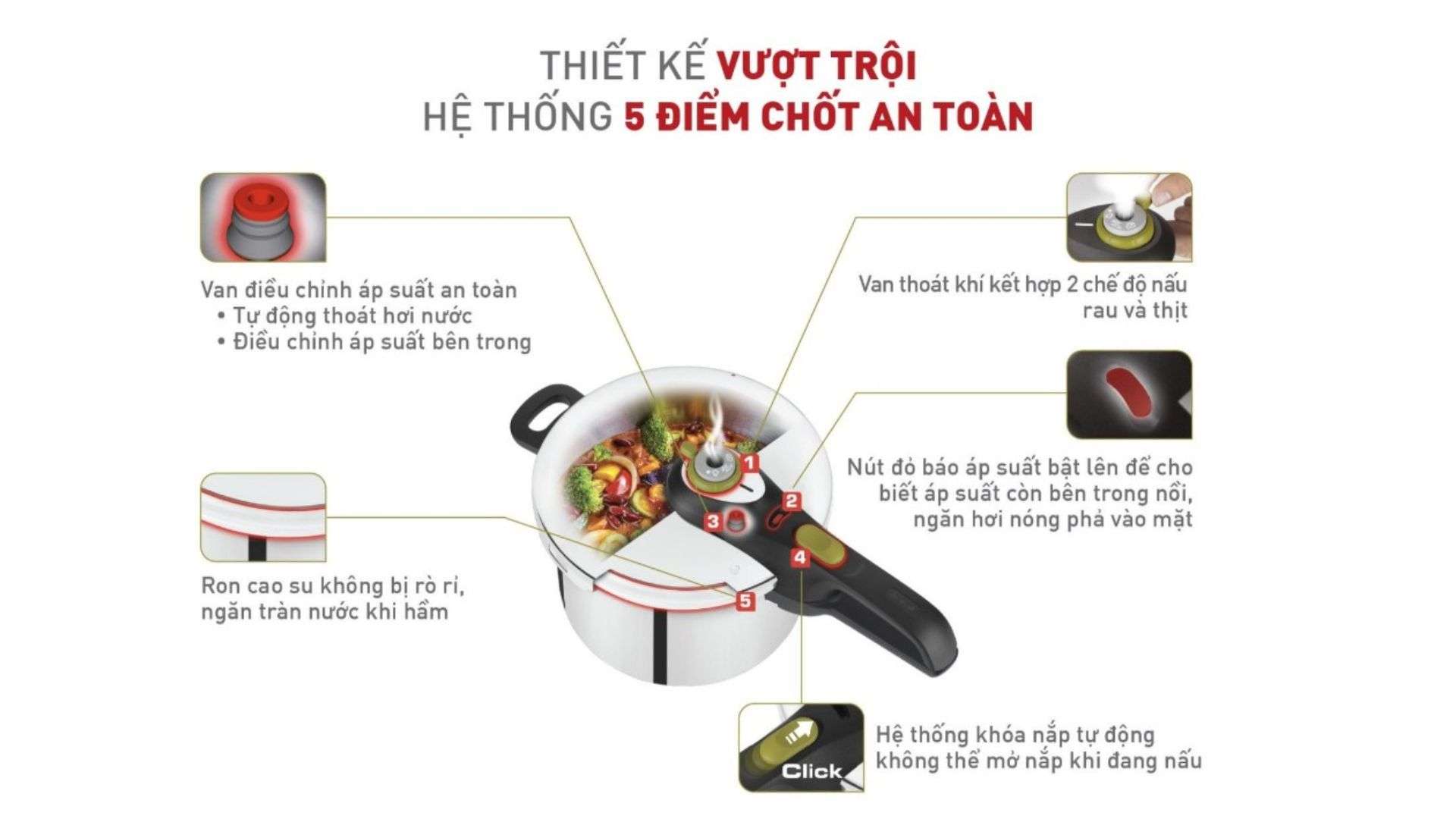 | 4. Khóa nắp cơ học | Chỉ cho phép mở khi áp suất trong nồi đã giảm hoàn toàn. |