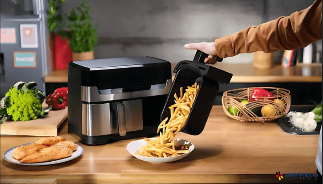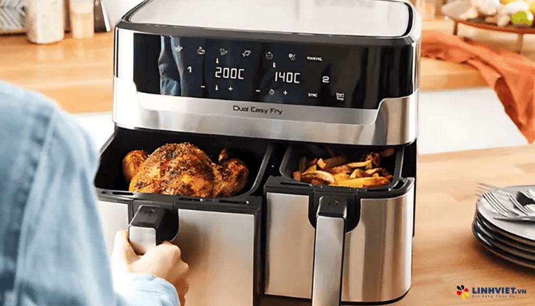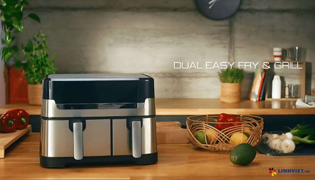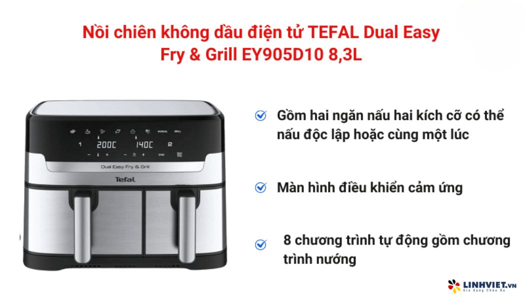 Nồi chiên không dầu điện tử TEFAL Dual Easy Fry & Grill EY905D10 8,3L là lựa chọn lý tưởng cho những ai yêu thích nấu nướng và muốn bảo vệ sức khỏe gia đình. Với công nghệ tiên tiến, sản phẩm tiết kiệm năng lượng và dễ sử dụng, chắc chắn sẽ là trợ thủ đắc lực trong căn bếp của bạn. Hãy trải nghiệm sự tiện lợi và hiệu quả của TEFAL Dual Easy Fry & Grill. Đặt hàng ngay tại Linh Việt để có mức giá tốt nhất!
