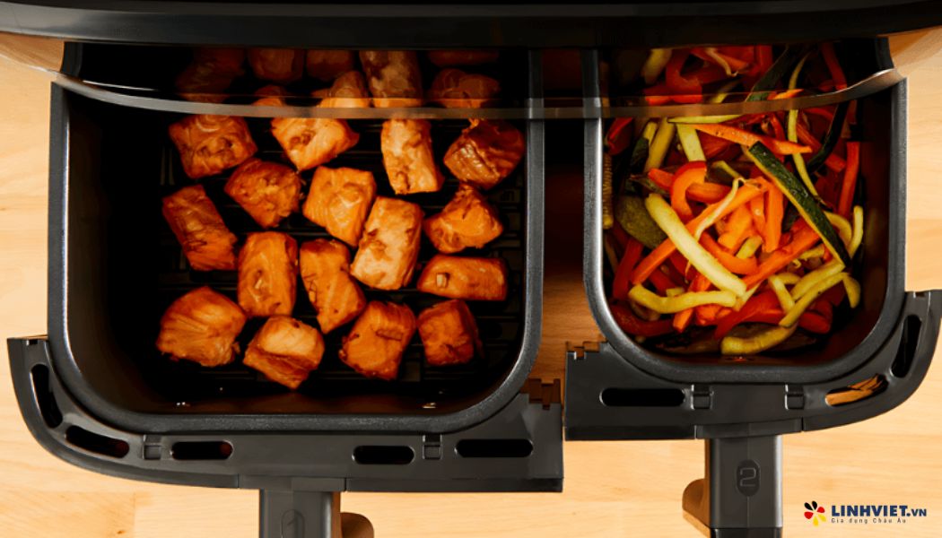 Nồi chiên không dầu TEFAL Dual Easy Fry & Grill EY905D10 có hai ngăn nấu riêng biệt: ngăn XXL 5,2L cho các nguyên liệu lớn như gà nướng và ngăn 3,1L tiết kiệm năng lượng cho khẩu phần nhỏ. Thiết kế này cho phép nấu hai loại thực phẩm cùng lúc, giúp bạn tạo ra bữa ăn hoàn chỉnh nhanh chóng.