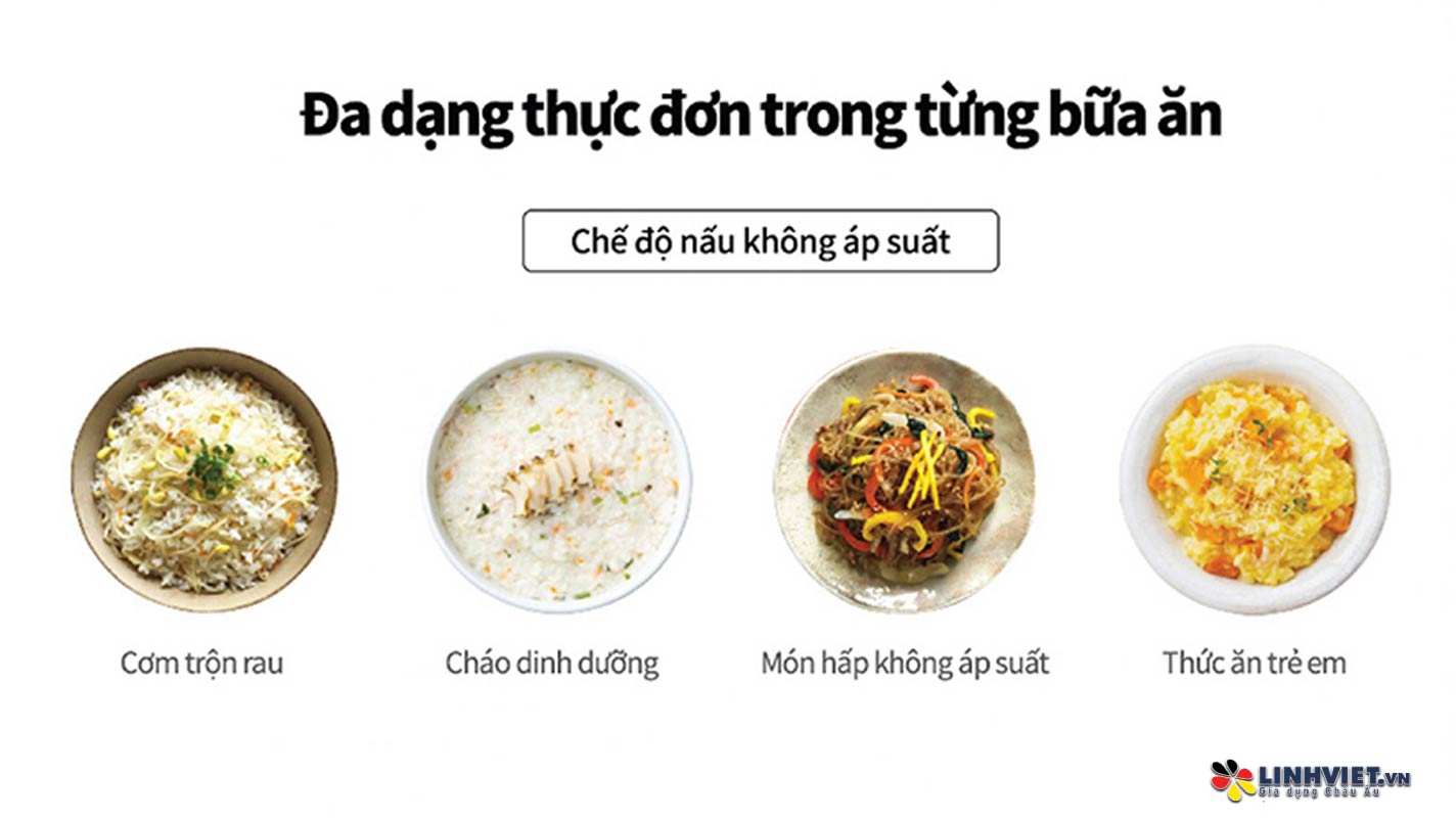 Nồi có thể chế biến đa dạng món ăn như nấu gạo lứt, đồ xôi, nấu cháo, hầm gà, làm súp, nấu canh, đảm bảo hương vị thơm ngon và giàu dưỡng chất. Nhờ tính năng này, người dùng có thể thay thế một số thiết bị nhà bếp khác, tiết kiệm chi phí và không gian, giữ cho bếp gọn gàng.
