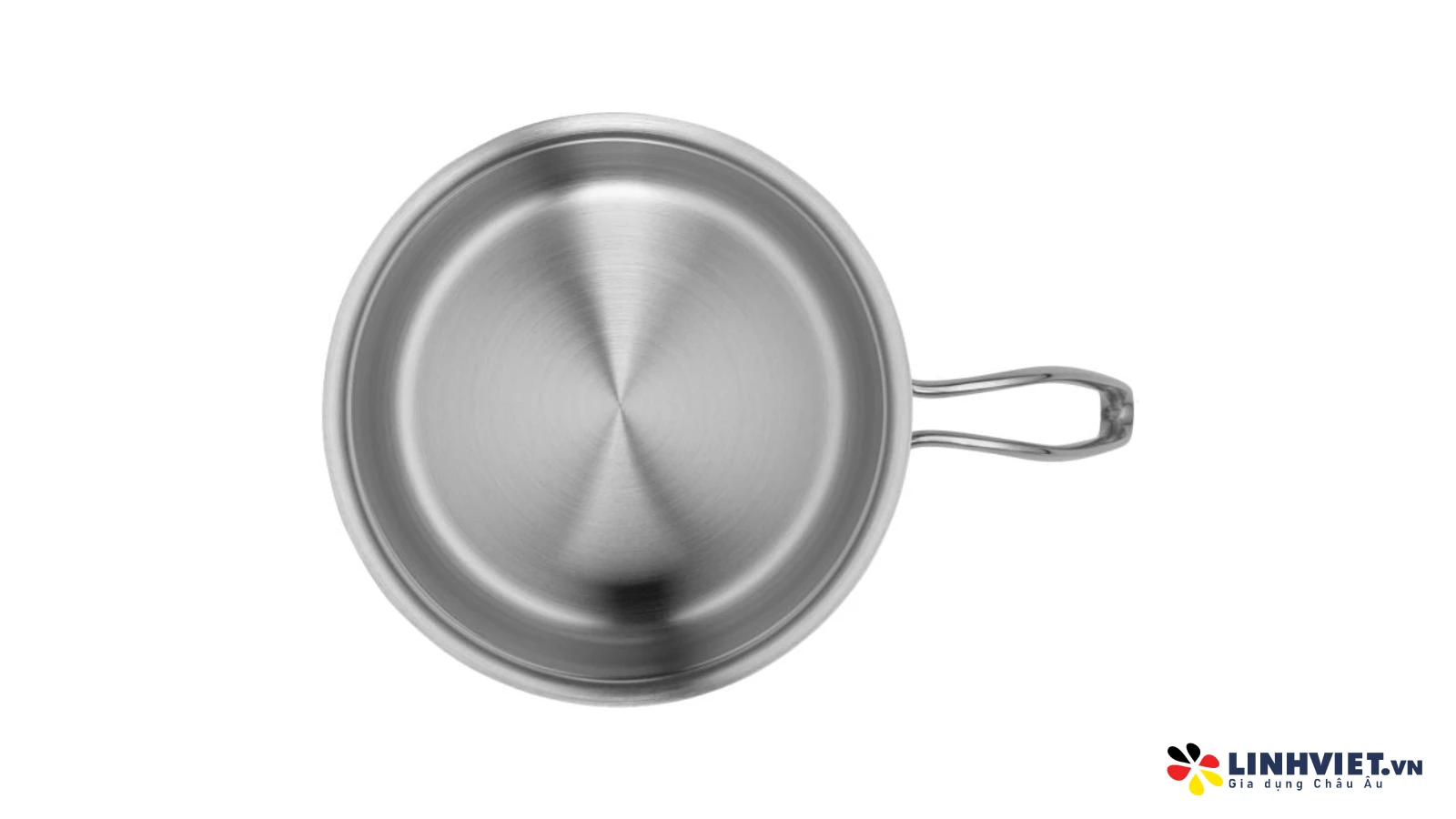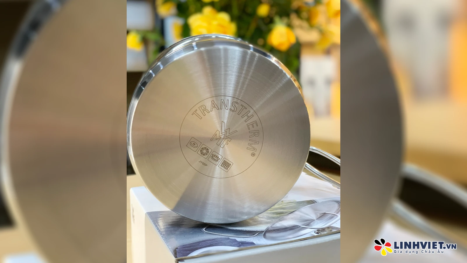Đáy nồi TransTherm® giúp hấp thụ và phân phối nhiệt đồng đều, giữ nhiệt lâu, phù hợp cho mọi loại bếp, kể cả bếp từ, và an toàn với máy rửa chén.
