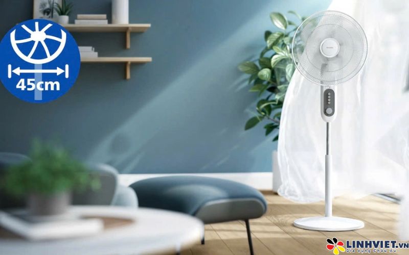 Quạt được trang bị động cơ tiên tiến, hoạt động êm ái với độ ồn tối đa chỉ 43dB, mang đến sự yên tĩnh cho không gian sống. Công suất 45W đảm bảo hiệu quả làm mát tốt mà vẫn tiết kiệm điện, phù hợp sử dụng lâu dài trong ngày hè nóng bức.