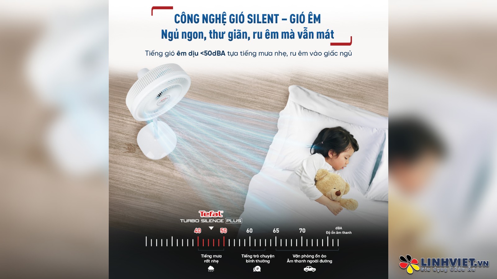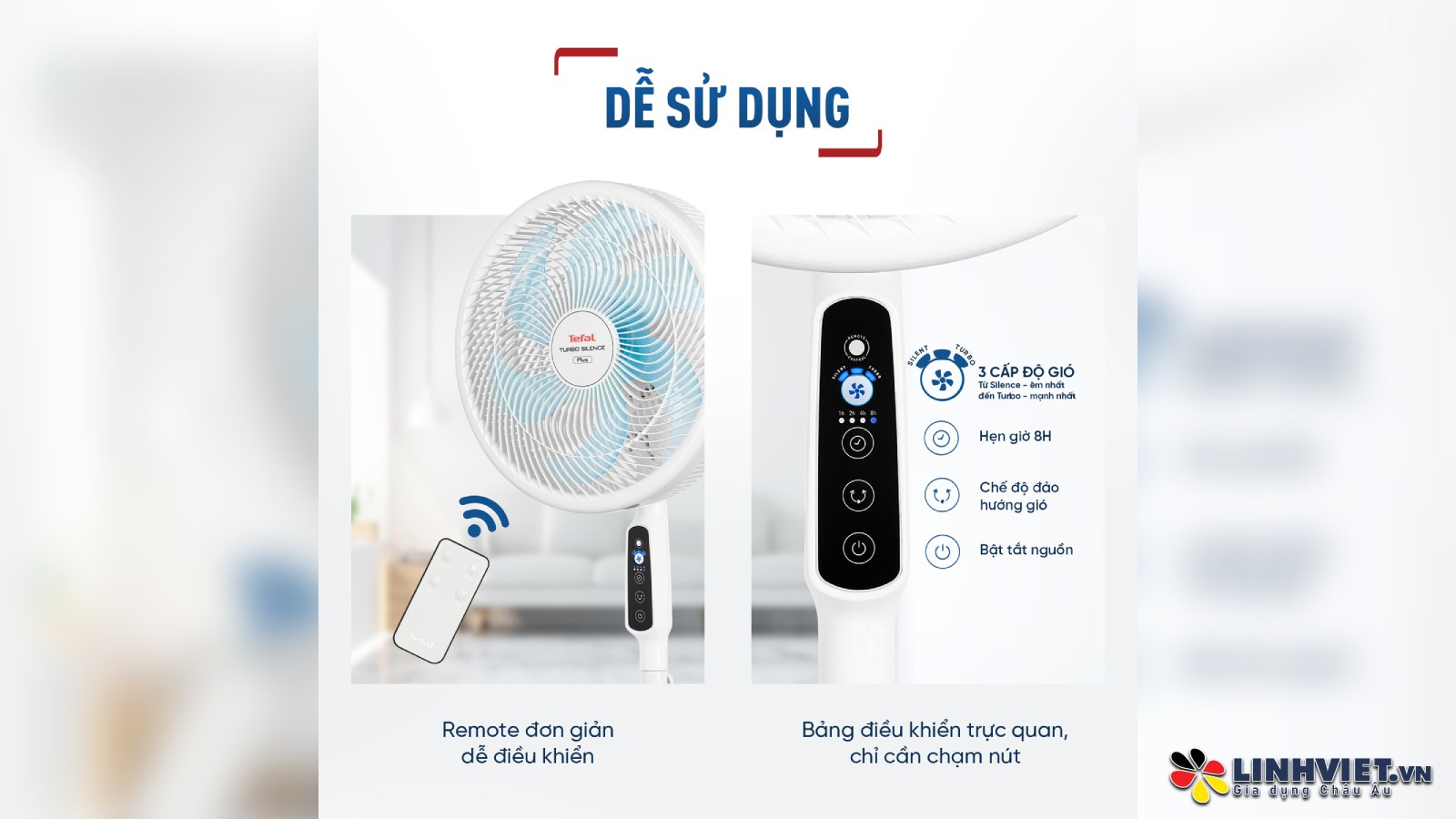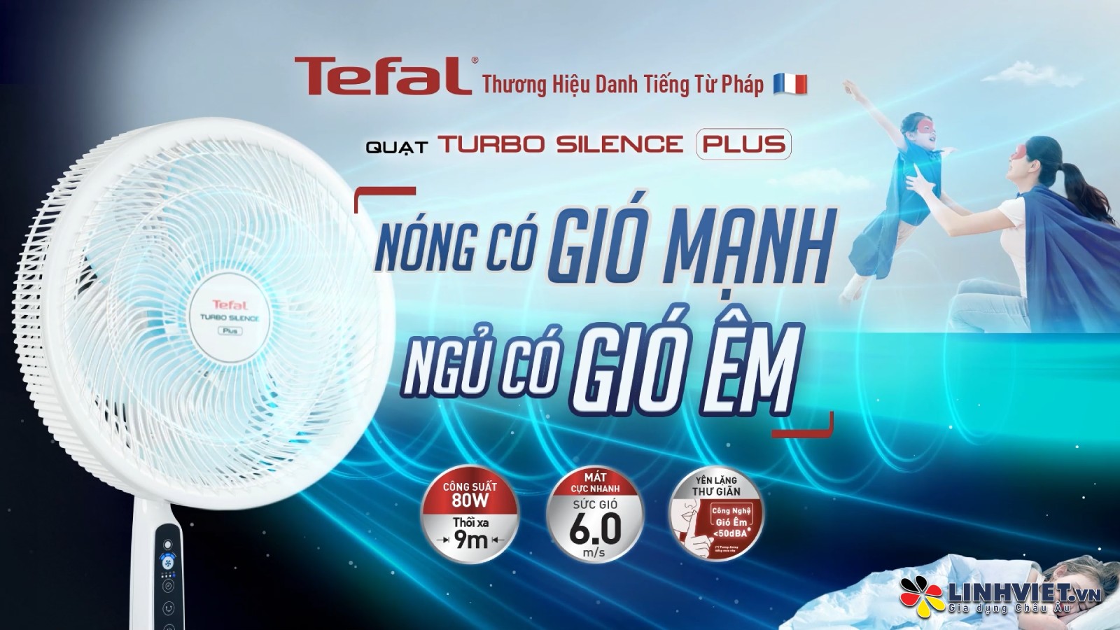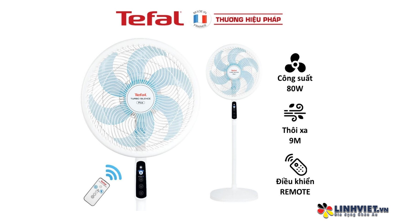 Quạt đứng Tefal Turbo Silence Plus VH689990, thương hiệu Tefal từ Pháp, chính hãng, được trang bị động cơ bạc thau 80W, mang lại luồng gió mạnh mẽ với lưu lượng 100 m³/phút.