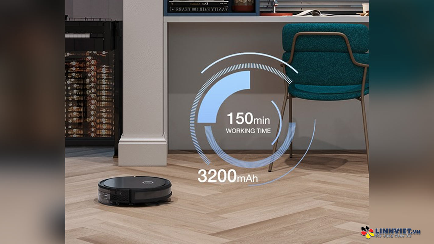 Với công nghệ tối ưu hóa năng lượng, robot hút bụi lau nhà Ecovacs Deebot U2 Pro sử dụng hiệu quả viên pin 3200mAh, cho phép hoạt động liên tục trong 150 phút. Trong điều kiện lý tưởng, robot có thể dọn sạch diện tích lên tới 250m² chỉ với một lần sạc đầy, đảm bảo hiệu quả làm sạch vượt trội.