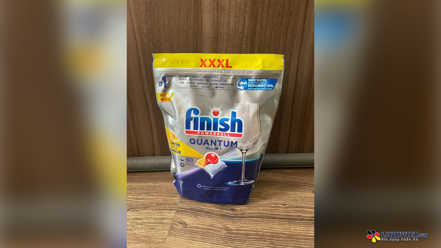 Viên rửa Finish Quantum All in 1 60 viên hương chanh sử dụng công thức enzyme đặc biệt, kết hợp công nghệ Nano Protector giúp loại bỏ vết dầu mỡ, thức ăn thừa và diệt khuẩn. Sản phẩm giúp chén đĩa sáng bóng, kèm hương thơm dịu mát sau khi rửa.